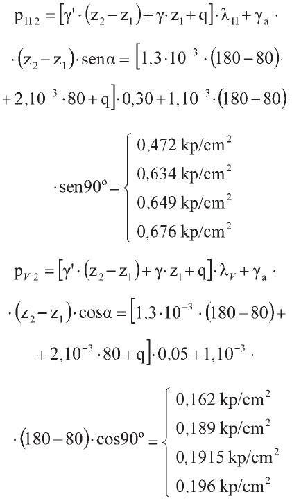 Las componentes horizontal pH 2 y vertical pV 2 de la presión sobre el muro, a una profundidad z2 por debajo del nivel freático (figura 13), son suma de cuatro componentes: la presión debida al terreno anegado (menos el empuje ascensional del agua), la presión ejercida por el terreno seco, la presión trasmitida por la losa de cimentación, y finalmente, la presión ejercida por el agua (dentro de la seguridad no se tiene en cuenta el índice de huecos).