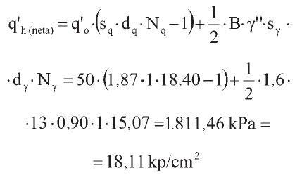 En el caso de las cuatro zapatas aisladas del edificio n.o 7, la situación más desfavorable –en cuanto a la presión efectiva neta de hundimiento– se da en las zapatas de 1,6·1,6 m2 de dimensión en planta (frente a las de 2,0·2,0 m2), ya que el último término de la ecuación de Terzaghi aumenta proporcionalmente con el ancho B de la zapata. Por tanto: