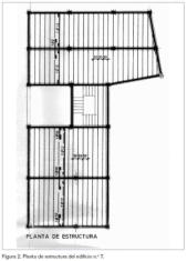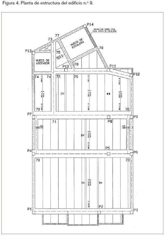 La estructura portante está constituida por pórticos de hormigón armado paralelos a la fachada, con dos crujías de luces significativamente diferentes (5,85 m del lado del edificio n.o 7 y 3,25 m en el contiguo) y 4 vanos en profundidad hasta el patio de manzana (figura 4). Los forjados son de cerámica armada, con un entrevigado de 70 cm.