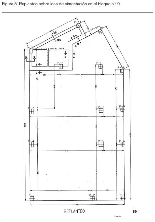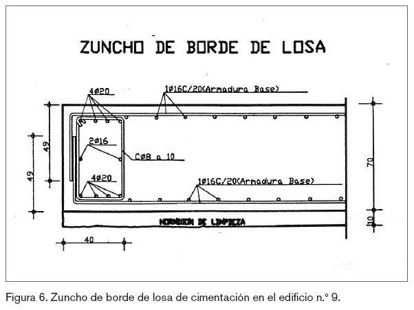 Es llamativo también el hecho de no haber proyectado plantas de garaje en el solar, e incluso del tipo de cimentación utilizado: superficial formado por una gran losa; solución cara y que requiere una cuidadosa ejecución. Quizás la principal justificación en el empleo de la misma es que con ella se obtienen unos asientos –de producirse– más regulares. De esta forma, se resuelve el problema de las grandes diferencias de carga (condicionadas por el diseño) a nivel de cimentación, producidas por el distinto número de plantas a cada lado del quiebro del edificio (ya mencionado en el apartado Descripción de los edificios). Y se evita de esta forma la solución alternativa de separar el bloque n.o 9 en otros dos a través de una junta de asiento, motivada por el cambio en la aplicación e intensidad de las cargas a ambos lados del solar.