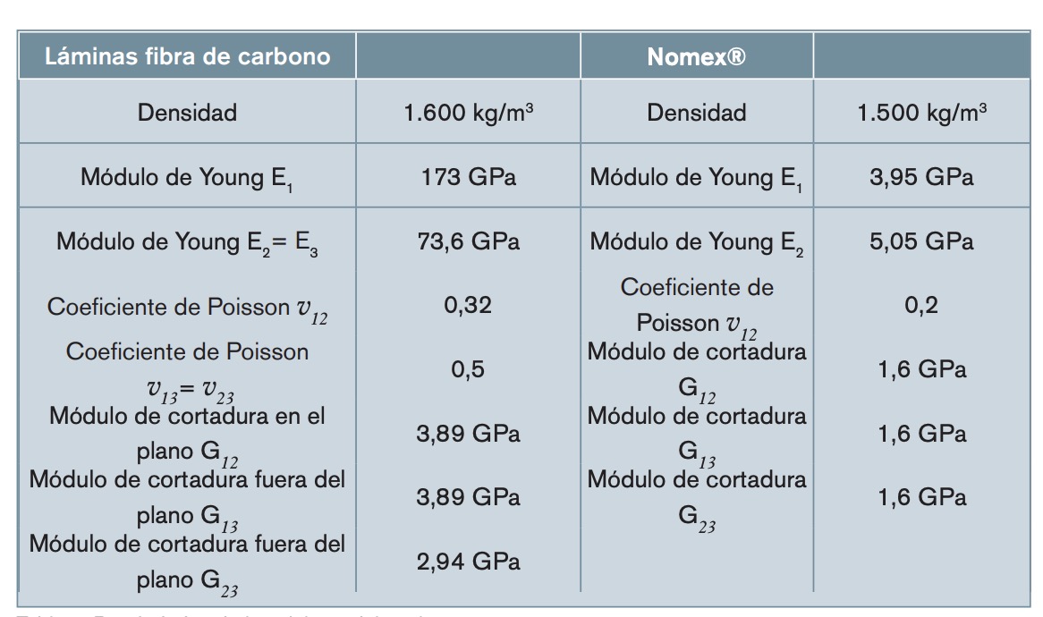 La viga sándwich está formada por dos pieles exteriores de CFRP y núcleo de nido de abeja de Nomex®. Las pieles constan de un laminado de 16 láminas de fibra de carbono en matriz epoxi, IM7/MTM-45-1 con una secuencia de apilamiento igual a [0/+45/90/-45]2S (Ridgard, 2008). El núcleo de nido de abeja está fabricado en Nomex® con denominación ANA-3.2, y está formado por celdas hexagonales y huecas, con una densidad nominal de 48 kg/mm3 (Honeycom, 2023). En la tabla 1 se muestran las propiedades de las pieles y del núcleo. Las direcciones 1, 2 y 3 coinciden con las direcciones X, Y y Z, respectivamente.