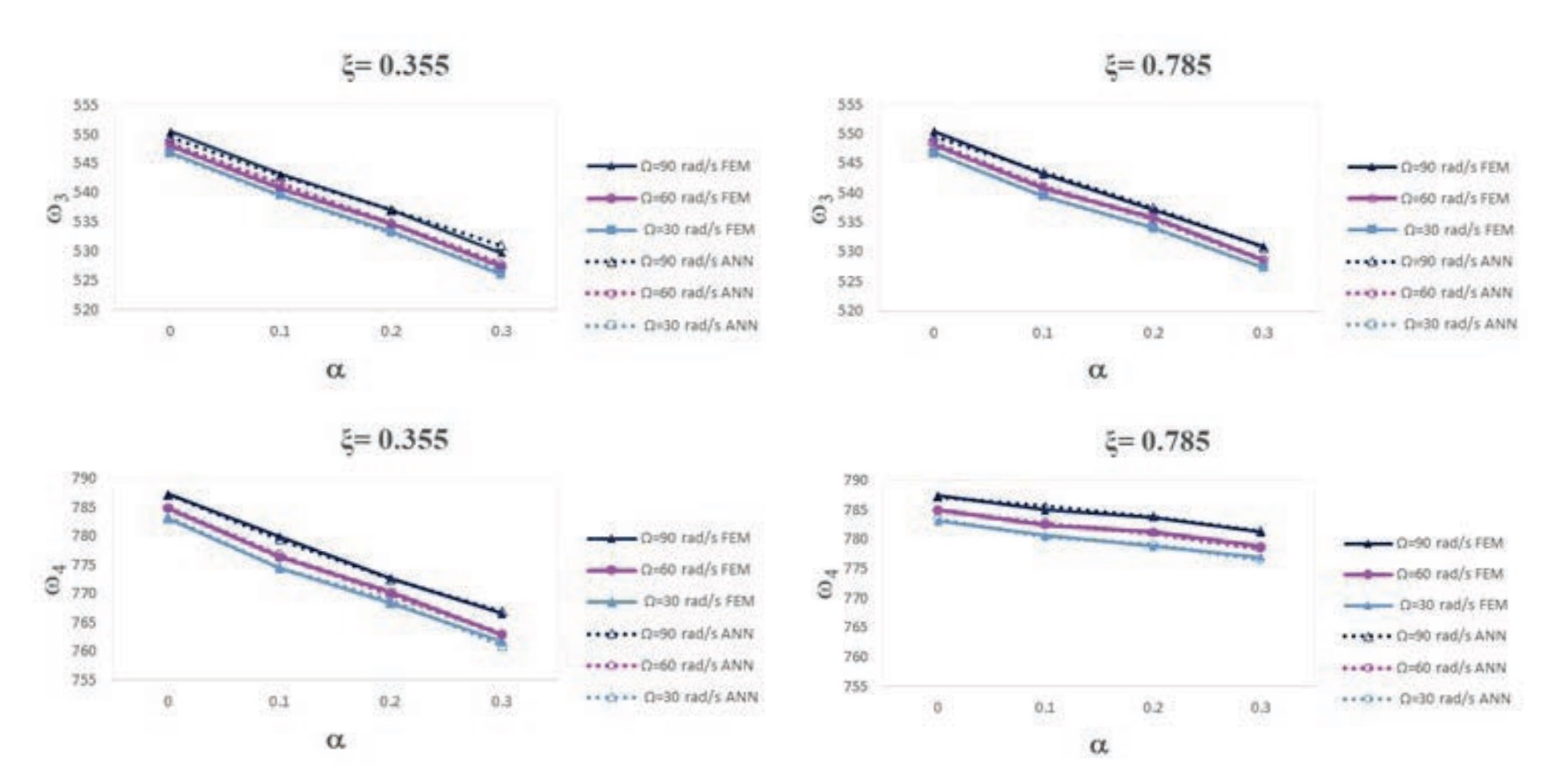 En la figura 10 se muestran los ejemplos de la comparación entre los resultados de la red propuesta y los datos numéricos de referencia para la tercera y la cuarta frecuencia natural y para las localizaciones de la discontinuidad = 0,355 y 0,785. Se han representado los valores de la frecuencia en función del tamaño del defecto para las tres velocidades de rotación ? = 30, 60 y 90 rad/s. Se puede observar que la concordancia entre los resultados obtenidos por la red y los numéricos es muy buena. Los resultados de la comparación correspondientes a otras localizaciones y a otras velocidades de giro son muy similares. Además, se ha calculado el error relativo medio (ERM) entre los resultados obtenidos con la red y los datos de referencia, de acuerdo con la ecuación (3). Teniendo en cuenta todos los casos considerados, el error obtenido es del 2%. (3)