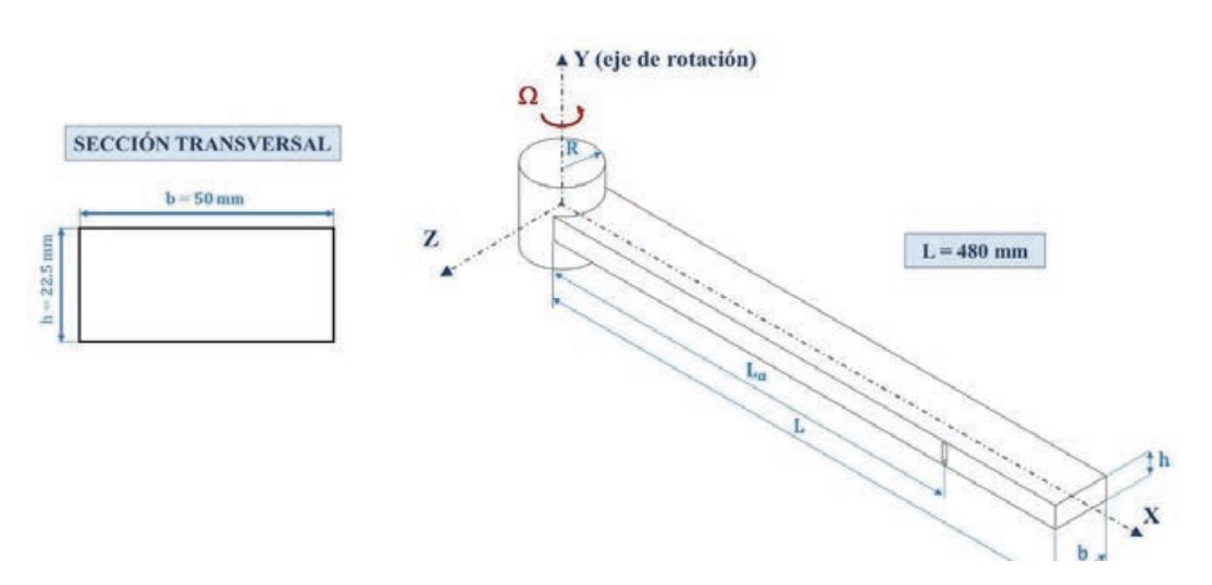 Se ha considerado una viga rotatoria fabricada de material compuesto que combina pieles de laminados de fibra de carbono (CFRP) y núcleo de nido de abeja (honeycomb) de Nomex®, cuyas dimensiones pueden verse se la figura 1. La viga gira con sentido antihorario alrededor del eje de revolución Y con velocidad angular constante ? y presenta una discontinuidad en el núcleo a una distancia La del extremo de la viga.