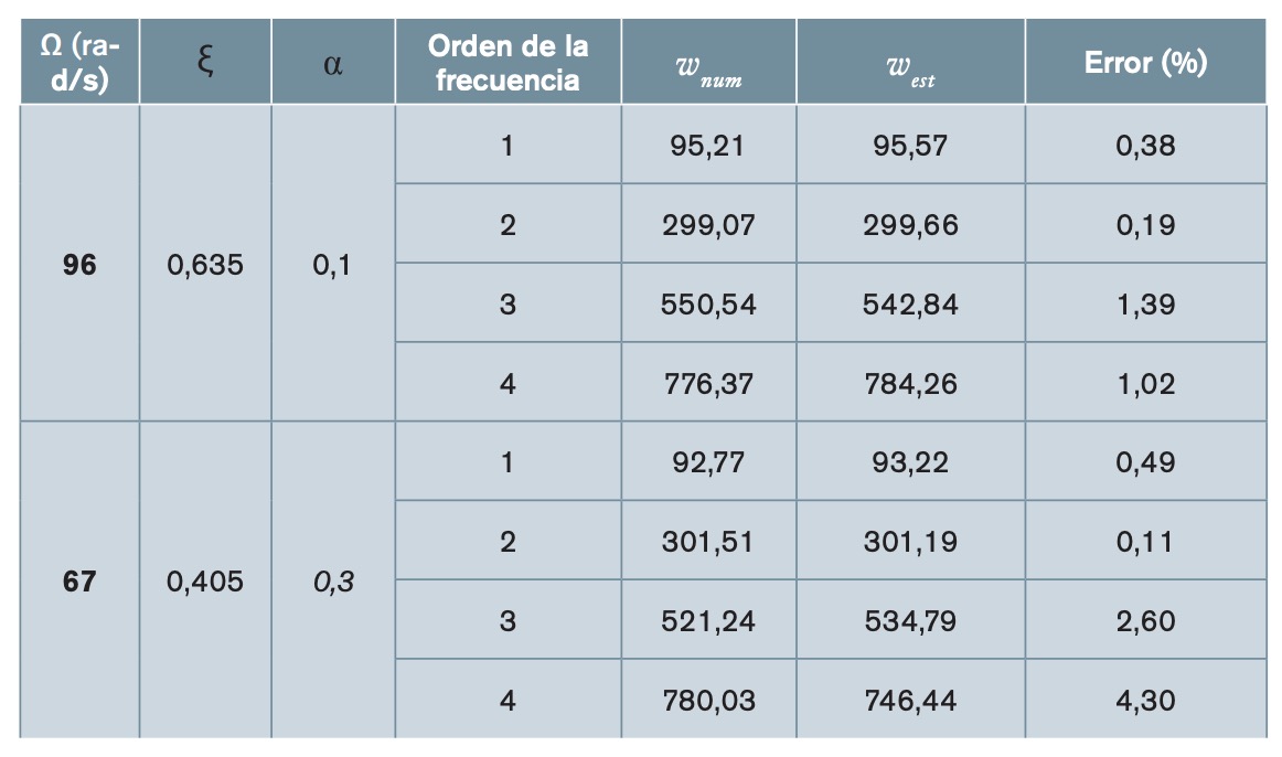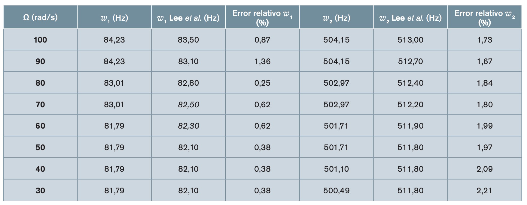 Primeramente, se han comparado los resultados con los obtenidos por Lee et al. (Lee, 2017). Puesto que en la literatura no se han encontrado resultados de las frecuencias de las vigas rotatorias de material compuesto que se han utilizado en este trabajo, con la finalidad de verificar el procedimiento se han comparado los resultados obtenidos con el modelo desarrollado fabricado con un material convencional, como es el acero, con los resultados de Lee et al. (Lee, 2017). La tabla 2 muestra la comparación de la primera y la segunda frecuencia natural para todas las velocidades de giro. También se pueden encontrar los valores de las frecuencias y los errores relativos en valor absoluto para cada velocidad. En ella se puede apreciar como los resultados de la comparación son excelentes con un error relativo máximo del 2,21%.