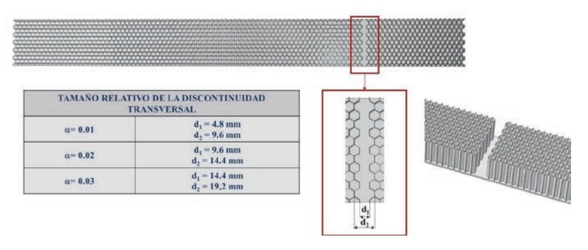 • El tamaño relativo de la discontinuidad = d1/L. Se han considerado diferentes tamaños relativos de la discontinuidad en el núcleo: = 0, 0,01, 0,02 y 0,03; el valor = 0 corresponde a una viga intacta. La figura 2 muestra la geometría de la discontinuidad transversal.