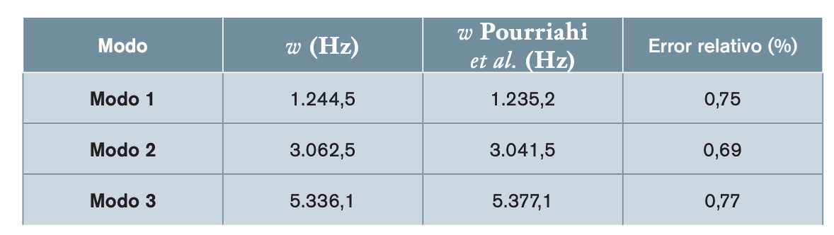 Antes de obtener los resultados de las frecuencias para todos los casos considerados se procedió a validar el modelo numérico desarrollado. Para ello, se compararon los resultados obtenidos con resultados de la literatura especializada.