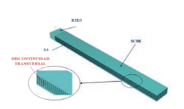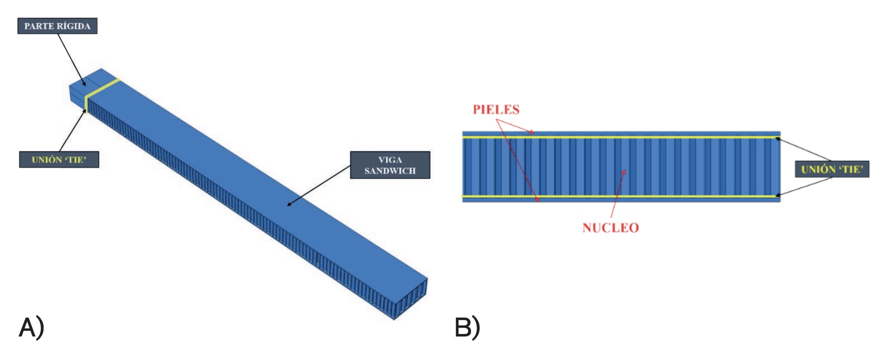 Ambos sólidos se unen con una interacción tipo tie, nomenclatura de Abaqus, que impide el desplazamiento relativo entre ambos. De igual manera, como se puede ver en la figura 3B, las pieles y el núcleo de la viga sándwich se unen mediante una interacción tie.