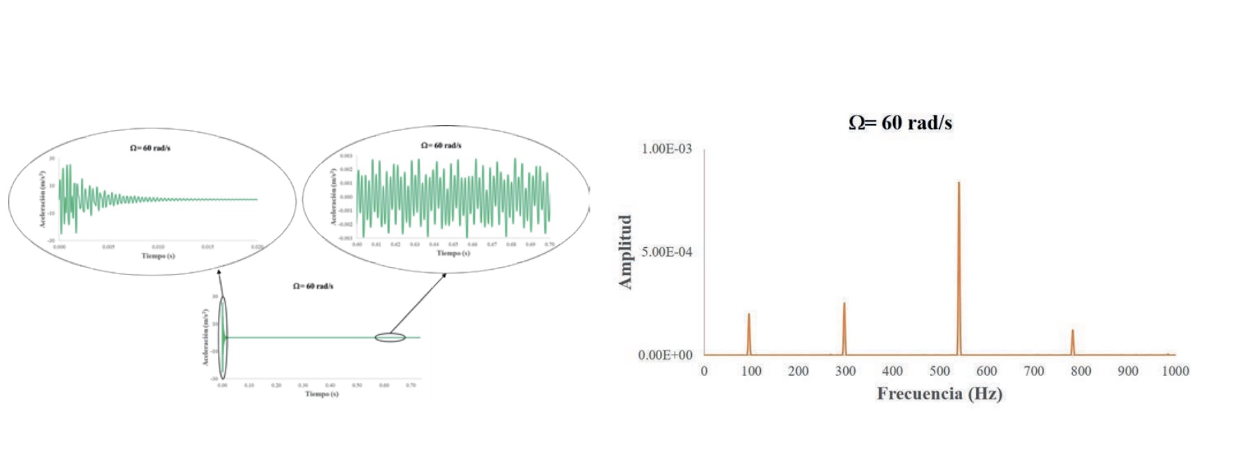 La obtención de las frecuencias naturales a partir del modelo numérico se ha realizado mediante un análisis en el dominio de la frecuencia de las aceleraciones en la dirección Y del extremo libre de la viga. La figura 5 muestra un ejemplo de la aceleración obtenida para una viga que presenta un agujero de tamaño relativo = 0,01 y que gira a ? = 60 rad/s.