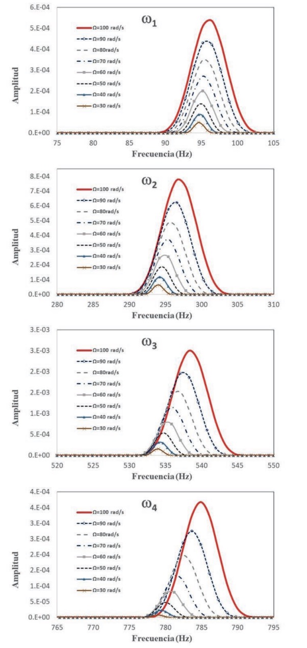 Una vez validado el modelo numérico, se obtuvieron las cuatro primeras frecuencias naturales para todos los casos considerados. En la figura 7 se muestra un ejemplo de los resultados obtenidos para la localización del defecto = 0,785 y para su tamaño = 0,02. Se ha representado la amplitud en función de la frecuencia para las cuatro primeras frecuencias naturales para las distintas velocidades de giro. Se puede observar cómo a medida que aumenta la velocidad de giro incrementa el valor de la amplitud y de frecuencia natural, lo que tiene sentido, ya que al aumentar la velocidad de giro, se incrementa la rigidez de la viga. Esta diferencia es más notable a partir de la segunda frecuencia natural. Estos resultados son análogos a los obtenidos para la viga intacta y para el resto de vigas dañadas.