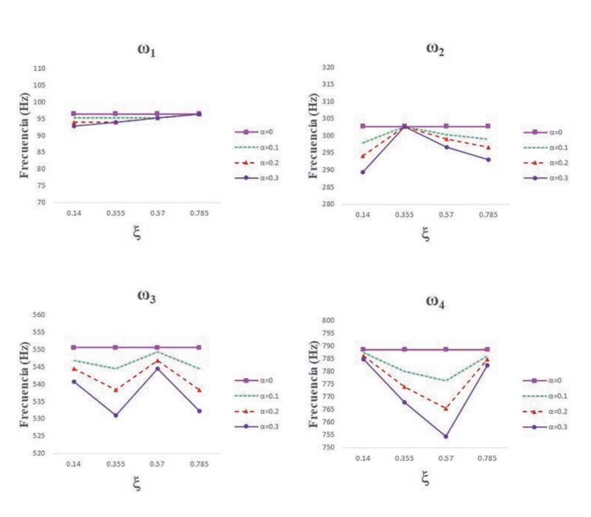 • Por último, para la cuarta frecuencia natural, el mínimo en el valor de la frecuencia para todos los tamaños se encuentra en la ubicación = 0,57. En las localizaciones = 0,14 y = 0,785 la frecuencia prácticamente no varía con el tamaño de la discontinuidad.