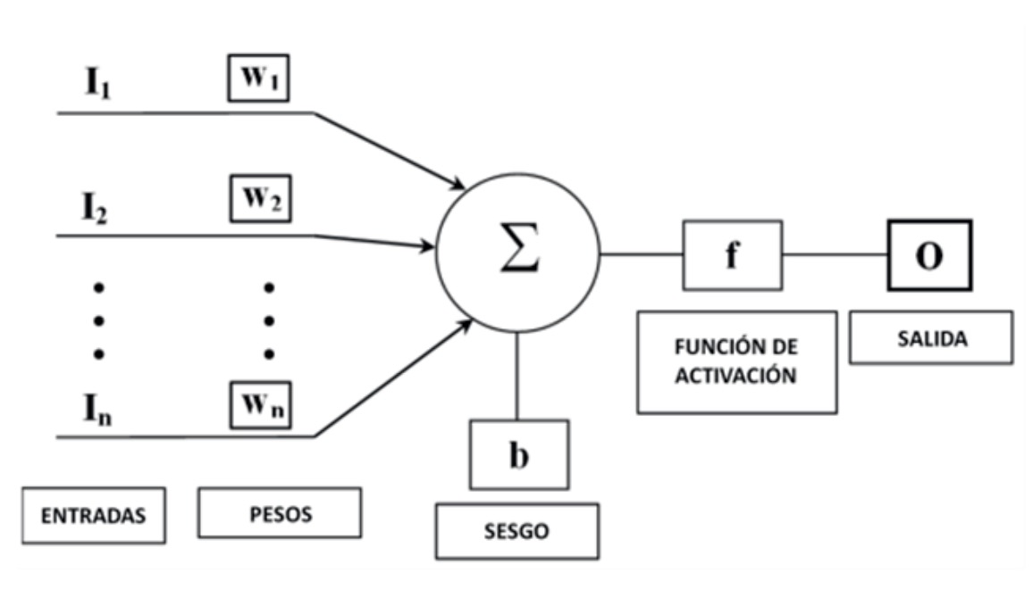 Las RNA son una herramienta matemática versátil que ha demostrado ser efectiva en la resolución de diversos problemas de ingeniería, entre otras aplicaciones. Su utilidad radica en su capacidad para identificar patrones y relaciones entre datos de entrada y salida. Estas redes buscan imitar el funcionamiento de los sistemas neuronales biológicos y están formadas por unidades denominadas neuronas. Cada neurona recibe múltiples entradas (Ii), que pueden provenir de fuentes externas o de otras neuronas dentro de la red. Luego, combina estas entradas y genera una salida. La salida (O) se determina mediante una función de activación aplicada al resultado de la suma ponderada de todas las entradas, es decir, cada entrada (Ii) se multiplica por un peso asociado (wi), y a este sumatorio se le añade un valor de sesgo (b) (Fig. 9). De esta manera, la relación matemática entre las entradas y la salida se expresa como