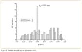 A partir de los valores de D y d, representados en las figuras 1-4, se han calculado los diámetros medios f, de las partículas de regranulados negros, así como (supuestas esféricas), , la superficie geométrica (Sgeo) de las mismas (tabla 1). En el caso de la muestra BR-4, figura 4, (considerando D =h y d =f) se han determinado los valores medios del diámetro de las bases y de la longitud del cilindro al que se pueden asimilar las partículas de este regranulado. El cálculo de la media ponderada (fp) de los valores de f se ha efectuado, para todas las muestras, teniendo en cuenta la distribución de los mismos que se observa en la figura 5, a modo de ejemplo.
