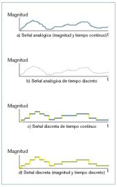 El ser humano se desenvuelve en un entorno donde las variables físicas que le afectan son fundamentalmente de naturaleza analógica, esto es, variables de magnitud continua definidas en todo tiempo (figura 1a). Este hecho le lleva inicialmente a proyectar, con la tecnología de la época, métodos básicamente analógicos para captar, transmitir y procesar las señales analógicas asociadas a las variables físicas de interés.