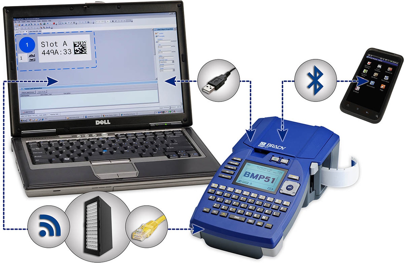 El modelo BMP51 ofrece diversas posibilidades de conectividad, como USB, tecnología Bluetooth, Ethernet y una tarjeta wi-fi opcional, para poder imprimir de forma inalámbrica desde cualquier ordenador o dispositivo Android. La conexión Bluetooth integrada en la Brady Network Card facilita la comunicación con Brady Mobile, la nueva aplicación móvil que permite a los técnicos diseñar, editar e imprimir etiquetas a través de teléfonos inteligentes.