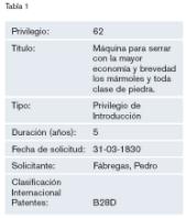 Se han hallado 19 Privilegios de Invención con fechas comprendidas entre el 27 de marzo de 1826 a 31 de julio de 1878 (más un expediente fechado en 1819). El primero de ellos por fecha de registro es el número 62 (Tabla 1).