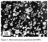 El poliestireno de alto impacto o poliestireno modificado con caucho (HIPS) es un termoplástico blanco, de translúcido a opaco, resistente al desgaste y con una elevada resistencia al impacto. Cabe destacar que, a escala microscópica, presenta una microestructura algo más compleja. Esto se debe a que es un material constituido por un copolímero que forma enlaces entre oligómeros de estireno y polibutadieno. Se comercializa bajo el nombre de poliestireno de alto impacto (HIPS) y se prepara disolviendo polibutadieno en estireno y polimerizando éste por procedimientos convencionales. El resultado final, además del polibutadieno y poliestireno, contiene pequeñas cantidades de un copolímero de bloque de estireno y butadieno, producido a partir de dobles enlaces del polibutadieno que se abren por acción del iniciador y que incorporan preferentemente el monómero estireno presente. Eso hace que la mezcla de PS y PBD esté estabilizada, porque los copolímeros de bloque quedan situados en la interfase de ambos polímeros, lo que disminuye la tensión interfacial facilitando la compatibilidad y estabilidad de la mezcla. La figura 1 muestra una imagen SEM en la que se puede ver la microestructura de un HIPS.