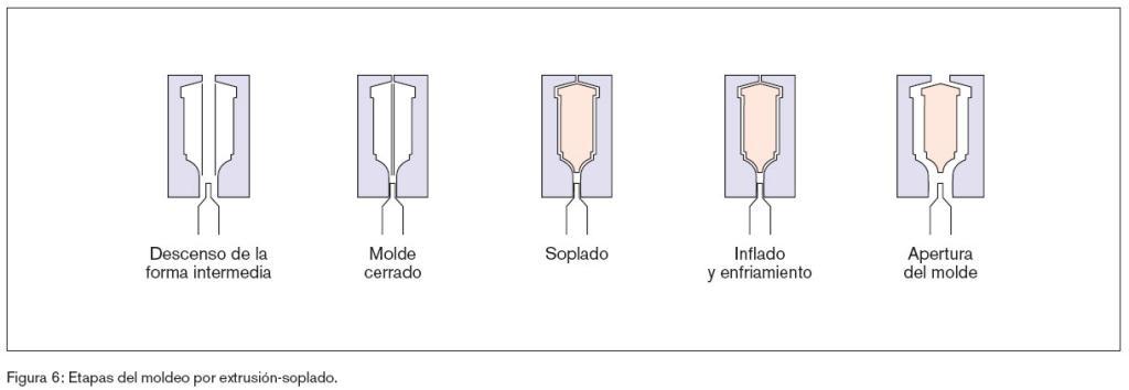 En el moldeo por soplado (figura 5 y 6) se sitúa un cilindro o un tubo de plástico (denominado preforma) a elevada temperatura, procedente de la extrusora, entre las mordazas de un molde. Se cierra el molde para aprisionar los bordes del cilindro y se insufla aire comprimido o vapor de agua a presión para forzar el material contra las paredes del molde y que adquiera su forma (etapa de soplado). En el proceso deben controlarse la temperatura y la viscosidad de la preforma.