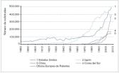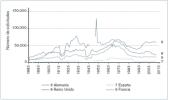 En las figuras 4a y 4b se muestra la evolución del número de solicitudes de patentes por oficina nacional de patentes de varios países en un amplio periodo histórico, de 1883 a 2010. Hay que señalar que el número de solicitudes reflejado en las figuras 4a y 4b incluye tanto las de registro nacional efectuadas por residentes en un país, como las efectuadas por no residentes en dicho país.