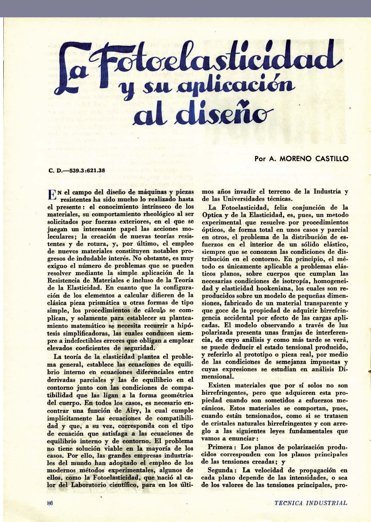 El artículo titulado La fotoelasticidad y su aplicación al diseño, publicado en 1952 en Técnica Industrial, realiza una presentación oportuna y rigurosa de esta técnica experimental, basada las propiedades de los materiales birrefringentes que permite la medición de la distribución de los esfuerzos que recibe una determinada pieza de maquinaria en su zona de trabajo. El primer experimento de fotoelasticidad se había realizado con éxito a principios del siglo XX (E. Coker y de L. Filon en la Universidad de Londres), y por aquel entonces la fotoelasticidad era una innovación técnica de aplicación al diseño de piezas, especialmente en nuestro país.