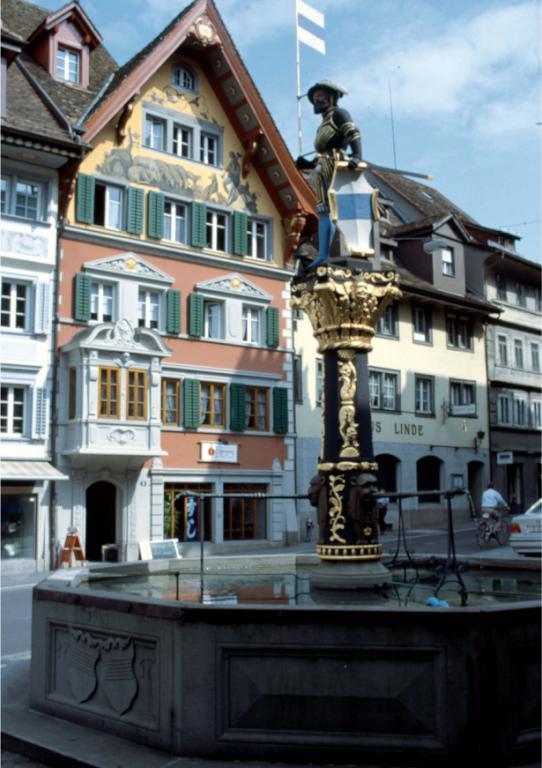 En los burgos católicos de Suiza se utilizan como remate los santos abanderados: san Mauricio, san Martín, san Pancracio. Abundan también las figuras bíblicas, como Moisés, santa Ana, la Virgen, el Cristo, y la Samaritana que daba de beber a los caminantes. En muchas ciudades encontramos alegorías de la Justicia y de las Virtudes: la Prudencia y la Fortaleza en Friburgo; la Templanza en Zúrich. En Berna es famoso el ogro que se come a los niños y el oso Mütz que lleva el estandarte de la ciudad.