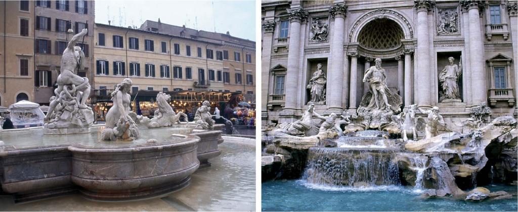 Desaparecen los deliciosos temas populares, como el Hombrecillo de los Gansos, que se conservan todavía en las viejas fuentes de Lucerna, Núremberg o Weimar. La fuente se transforma en un gran decorado artístico; pero pierde su intimidad, su lenguaje sencillo y humano. Algunas de estas fontanas, como la madrileña de Cibeles, forman parte de una amplia perspectiva urbanística; decoran las plazas, las encrucijadas, los recintos monumentales.