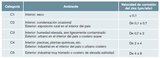 La Norma UNE EN ISO 14713 establece distintas categorías de corrosividad atmosférica, según refleja la tabla 1.