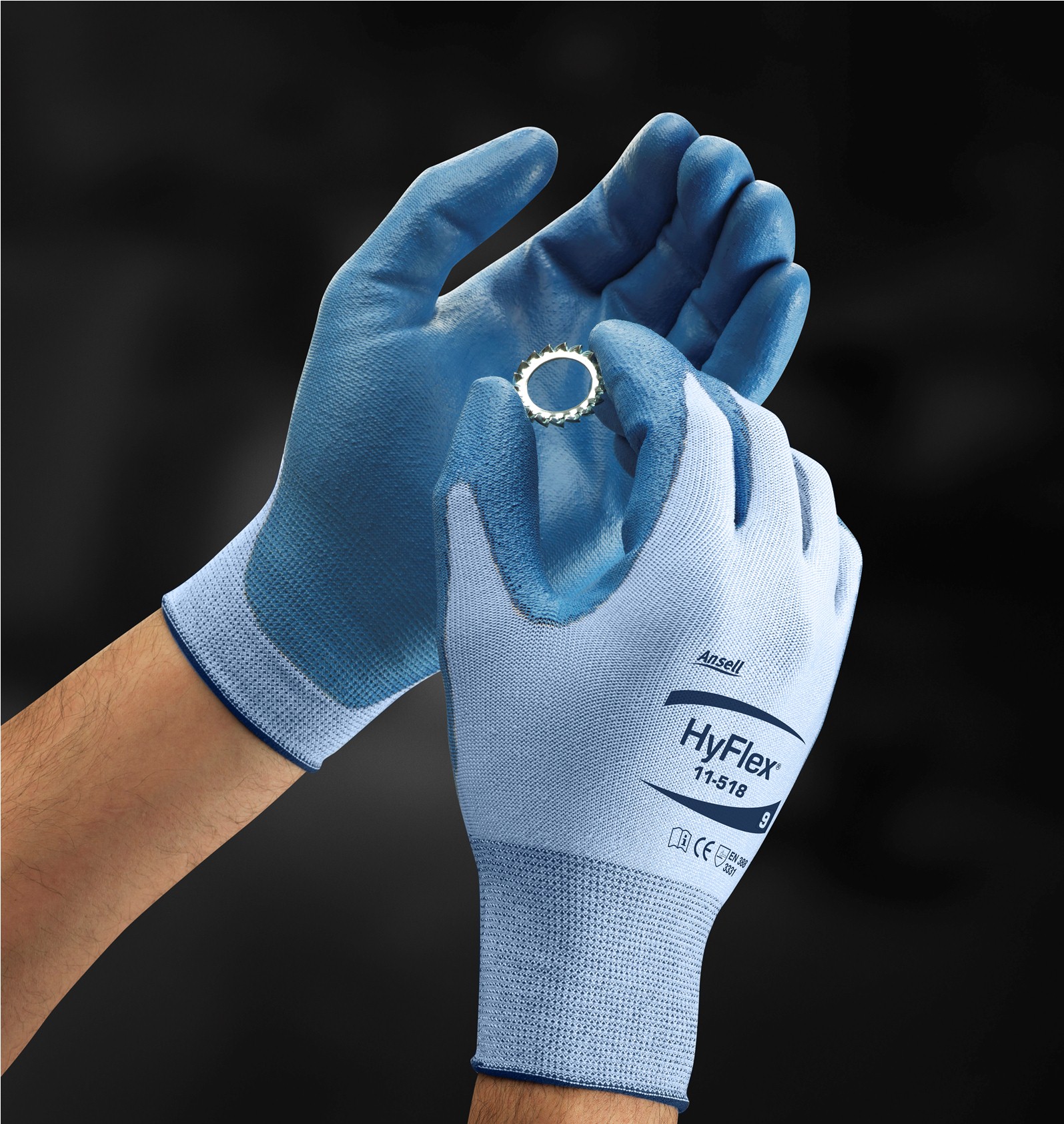 Normalmente, para lograr los altos niveles de protección anti-corte necesarios en entornos industriales, los guantes suelen ser de un material de galga más grueso, que abulta más y que disminuye la destreza y la comodidad. La nueva generación de guantes HyFlex 11-518 es la respuesta ideal: son los guantes más finos del mercado y ofrecen una protección anti-corte EN de nivel tres, permitiendo al usuario mantener o mejorar la destreza con la mejor protección posible.»