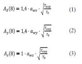 donde awj representa el valor eficaz de la aceleración ponderada en frecuencia según los ejes ortogonales x, y, z (según norma UNE-ISO 2631-1:2008, que es la versión oficial de la Norma Internacional ISO 2631-1:1997 a la que se remite en el anexo del Real Decreto 1311/2005); Texp corresponde al tiempo de exposición y T0, al tiempo de referencia de 8 horas.