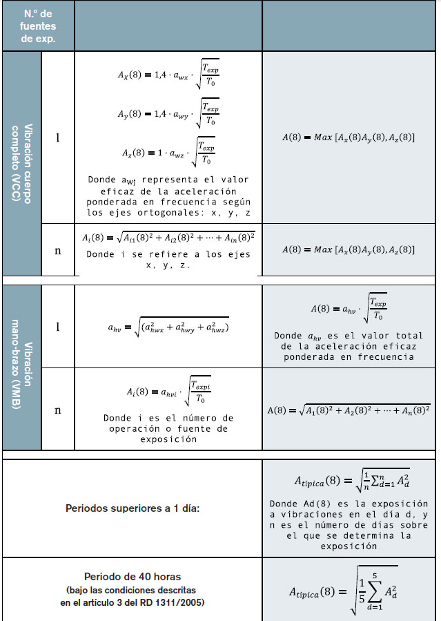 La norma UNE-EN ISO 5349-2 a la que remite el Real Decreto 1311/2005 con relación a la medición, propone en su anexo B (informativo) que para la evaluación de la exposición a vibraciones para periodos superiores a un día se utilice la expresión: