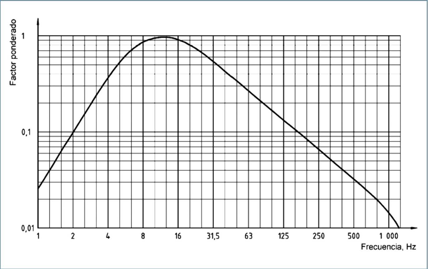 Por otra parte, debido a que hay frecuencias más perjudiciales que otras, los valores de la aceleración medidos en cada una de las bandas de tercio de octava se ponderan de acuerdo con unos factores que, por regla general, incorporan los instrumentos de medida (vibrómetros) (INSHT, 2009). Se adjunta la figura 5 a modo de ejemplo de la ponderación en frecuencia para las vibraciones transmitidas por la mano (VMB).