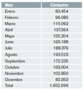 Ante la dificultad de publicar la curva de carga horaria o cuarto horaria anual, por la extensión que ello supondría, en las tablas 7, 8 y 9 se detalla la energía anual consumida, por peajes y desglosada de varias formas.
