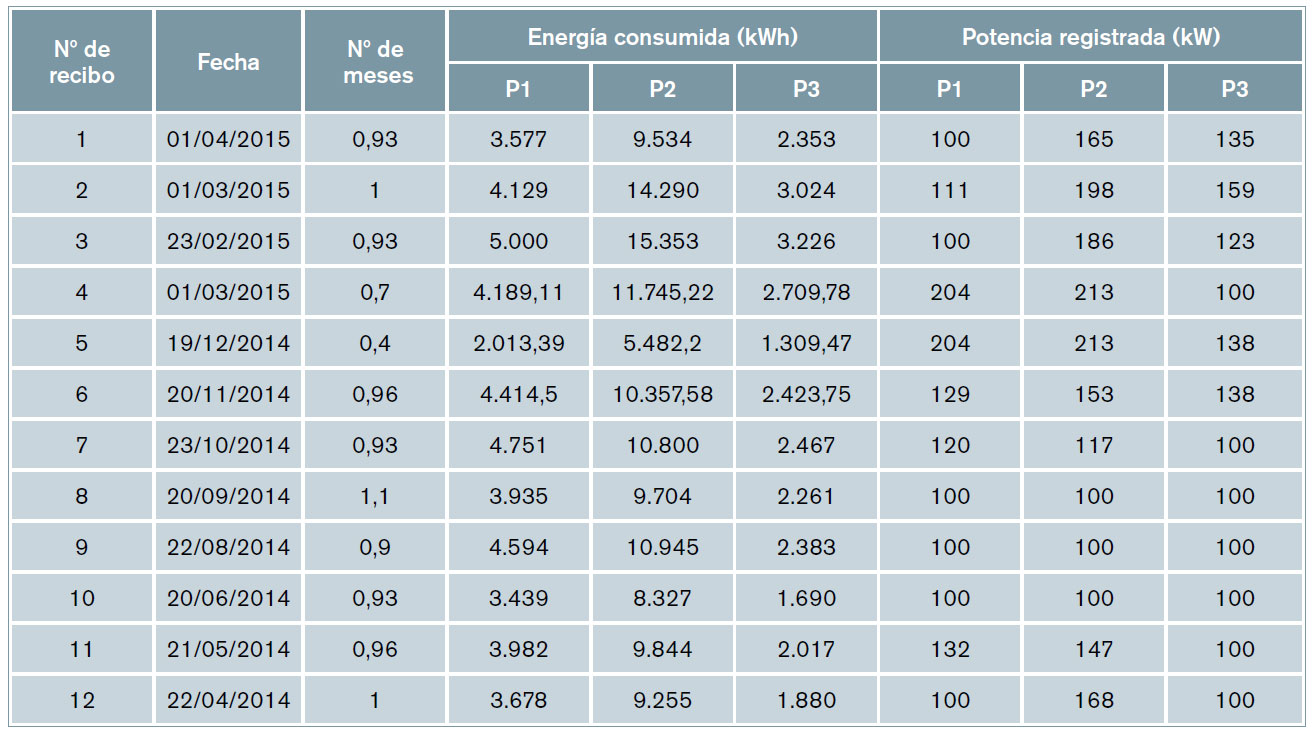 En la tabla 1 se pueden ver los consumos de energía activa, así como las potencias demandadas y registradas en cada momento, que se han utilizado para elaborar el presente estudio y se pueden apreciar en las figuras 3 y 4.