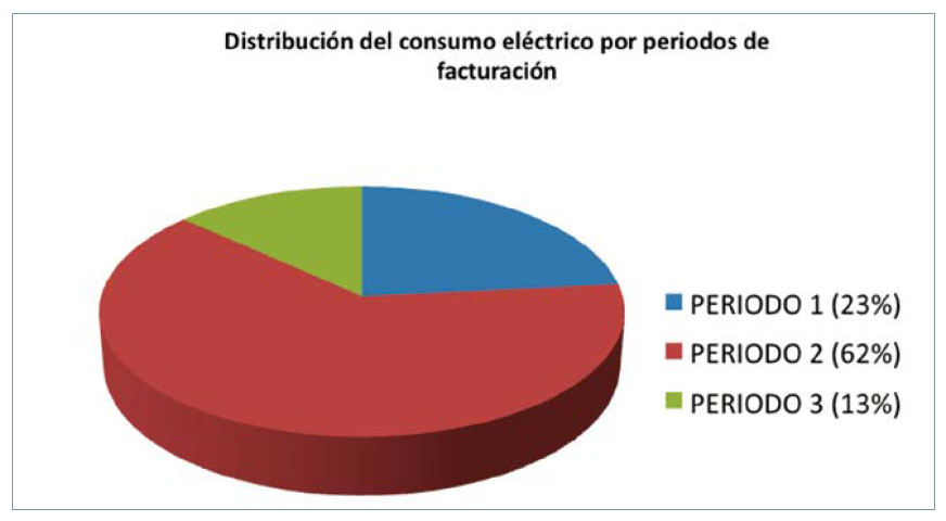 La tarifa contratada en este suministro es la 3.0 A, con discriminación horaria en tres periodos y la potencia contratada en cada uno de ellos es de 100 kW. En la figura 2 se puede ver la distribución del consumo por periodos de facturación, referidos a P1, P2 y P3 de la tarifa 3.0 A.