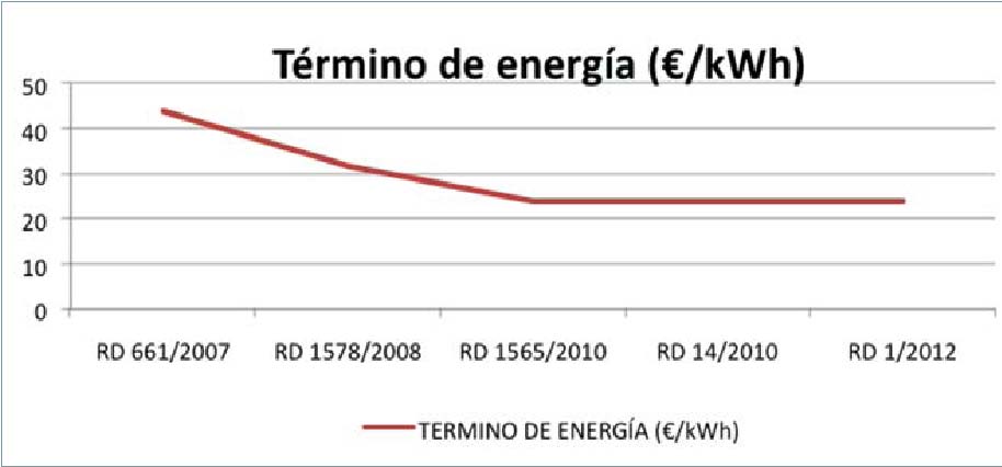 Con la entrada de un nuevo Gobierno, se publicó el Real Decreto 1/2012, que venía a suspender los procesos de asignación de retribución y los incentivos económicos para nuevas instalaciones de producción en régimen especial de explotación. Así en el artículo 3 suprime las tarifas reguladas, primas y límites previstos en el RD 661/2007. Además, se elimina el complemento por eficiencia y de energía reactiva (figura 8).