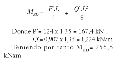 El momento máximo para la carga concentrada actuando simultáneamente con el peso propio de la viga será: