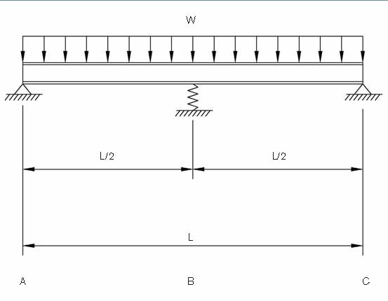 Un ejemplo sencillo de cálculo de reacciones en apoyos elásticos es el de una viga continua, cargada uniformemente, con un apoyo elástico interior. La viga estará rígidamente soportada en los puntos A y C y elásticamente en el punto B (figura 3).