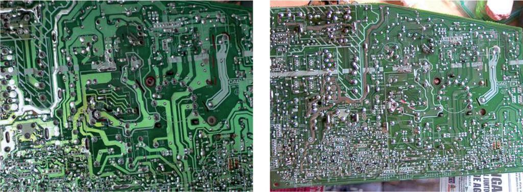 La búsqueda de soldaduras frías en un circuito electrónico no es una tarea fácil; una lupa puede ser de ayuda. Pero en general el buen estado de una soldadura lo determina la cantidad de estaño aportado y que esté brillante. Con el paso del tiempo se observa disminución de estaño en la soldadura y ésta deja de estar brillante. Al respecto podemos ver la diferencia entre una placa de cirAcuito impreso con soldaduras desgastadas (figura 2) y la misma placa con soldaduras repasadas (figura 3).