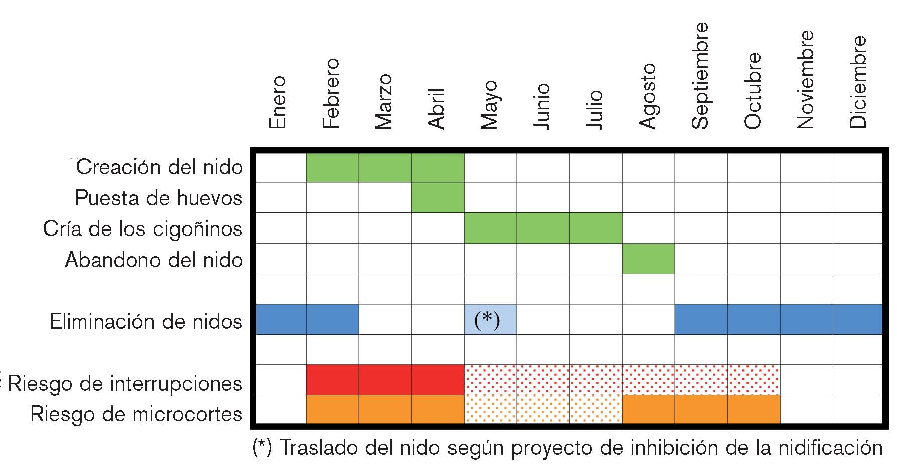 La eliminación del nido de la cigüeña se podrá realizar, en condiciones nor-males, desde septiembre a febrero. De manera excepcional y solamente si se siguen los pasos definidos por el Proyecto de Inhibición de la Nidificación de la Cigüeña Blanca, a finales del mes de mayo también se podrá llevar a cabo la retirada del nido.