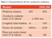 Se podrán utilizar conductos radiantes OHA 20, OHA 50/100, OHA 150/200. Por ejemplo, OHA 200 tiene las características básicas que se pueden ver en la tabla 2.