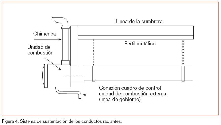 El sistema de sustentación de los conductos radiantes, como se puede ver en la figura 4, es realmente simple: consta de una estructura metálica con unas cadenas que permiten fijar el conjunto a la estructura metálica de la propia nave o a unos perfiles colocados al efecto.