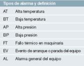 En primer lugar, se definen los rangos de alarmas. Esto se realiza por el personal de mantenimiento autorizado, de forma que desde la pantalla en la que se ubica un equipo con alarma predefinida, este operador puede configurar los distintos niveles posibles de alarma: muy alto, alto, bajo y muy bajo. Por ejemplo, para una magnitud variable con alarma predefinida como puede ser la pérdida de carga en un filtro de aire de ventilación, tendremos la opción de que el operador defina las siguientes alarmas, según se indican en la tabla 2.