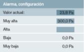 Para esta configuración, tenemos un primer disparo de alarma que indica que se ha superado una pérdida de carga de 200 Pa. Esto significa que debemos cambiar pronto el filtro de ventilación. Con el segundo disparo, se confirmaría que no habremos realizado el cambio de filtro con éxito durante el tiempo disponible, por lo que se ha llegado al nivel de alarma muy alto, haciendo irremediable la sustitución del filtro con carácter inmediato para el correcto funcionamiento de la instalación.