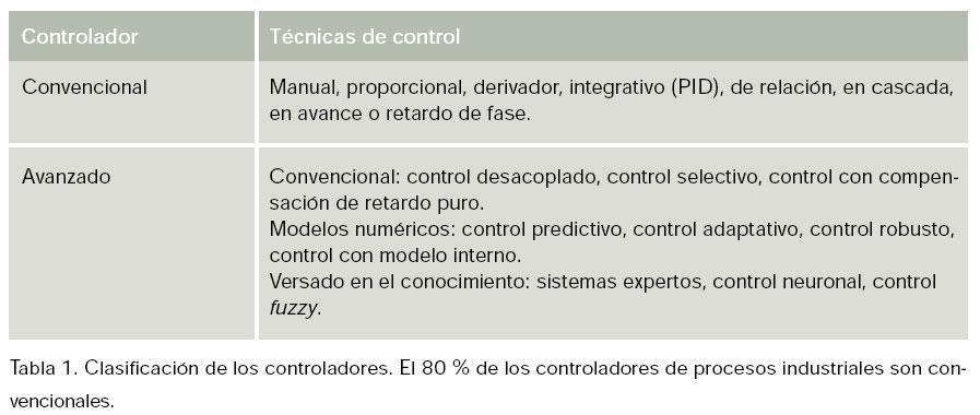 Para el diseño de controladores, sean de tipo convencional o avanzado, es necesario disponer de un modelo matemático preciso del proceso a controlar, que nos ayude al diseño de los algoritmos de control. Se incluye una clasificación de los controladores en la tabla 1.