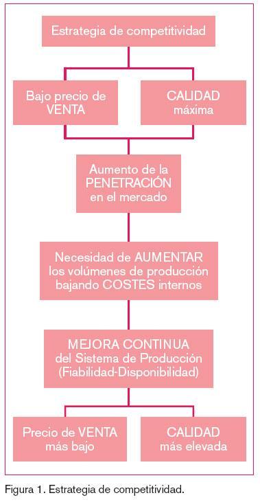 1. La competitividad creciente con una estrategia basada en el binomio calidad-precio (figura 1) y en la que tiene cada vez más importancia conseguir una disponibilidad-rendimiento óptimos en los nuevos sistemas de producción.
