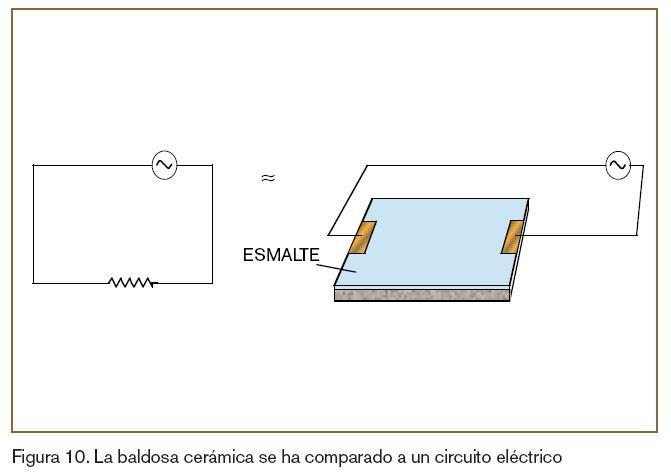 Para lograrlo, y siguiendo con la investigación en las propiedades eléctricas de las baldosas cerámicas, se ha comparado ésta a un circuito resistivo, tal y como se indica en la figura 10, de forma que al aplicar una diferencia de potencial a un esmalte conductor se genera calor por efecto Joule.