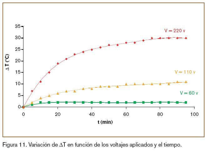 El calor generado produce un aumento de la temperatura de la pieza, destacando que este aumento de temperatura depende de la diferencia de potencial al cuadrado (V2), tal y como se puede observar en la gráfica de la figura 11.