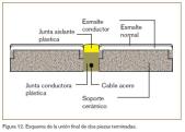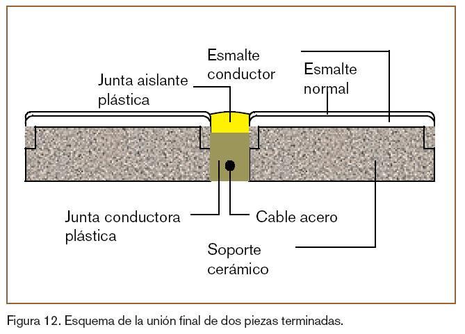 La instalación final propuesta consta de los siguientes componentes: transformador, acumulador de calor, termostato y diferencial. Esto permite en todo momento regular la temperatura a la que está el suelo cerámico, creando un ambiente mucho más acogedor y cálido. Toda la instalación se ha realizado manteniendo siempre las condiciones de seguridad que permiten un uso sin riesgos, es por ello que la baldosa cerámica esmaltada con el esmalte conductor está recubierta por otro esmalte normal que por su propia naturaleza es aislante. Esto proporciona un aislamiento por arriba de la baldosa, mientras que la parte de abajo está aislada gracias al soporte, el cual a la vez de servir como acumulador térmico es aislante eléctrico. Para hacer llegar la corriente eléctrica a todas las baldosas, se utiliza una junta conductora plástica recubriéndola con una junta aislante para mantener en todo memento la seguridad de la instalación. En la figura 12 se muestra un esquema de la unión de dos baldosas terminadas.