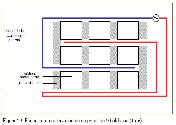 Por otra parte, hay que asegurar que a todas las baldosas les llegue el flujo eléctrico pero sin que estén todas en contacto, ya que esto conduciría a un colapso del sistema. En la figura 13 se muestra el diseño de la colocación de un panel (o suelo) de 1 m2 (figura 14). Teniendo en cuenta lo anteriormente mencionado y debido a que se trabaja en un flujo de corriente alterna, no existen polos ni positivos ni negativos, la diferencia de color de los dos cables es para simplificar el entendimiento de que cada baldosa cerámica debe estar conectada a las dos fases de la corriente alterna.