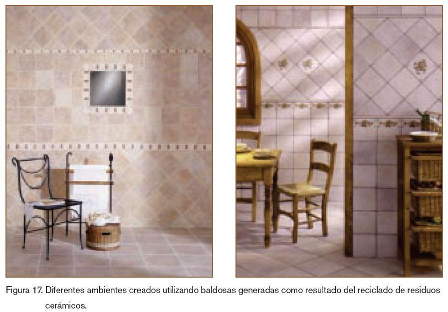 En este aspecto, se ha desarrollado un nuevo producto como resultado de la investigación en el reciclado de la mayoría de tipologías de residuos cerámicos generados por la Industria Cerámica, siendo éste una baldosa cerámica esmaltada de gres de pasta roja y teniendo en cuenta la optimización medioambiental de todas las etapas que afectan al proceso de fabricación de la misma. En la figura 17 se muestran diferentes ambientes del producto terminado.
