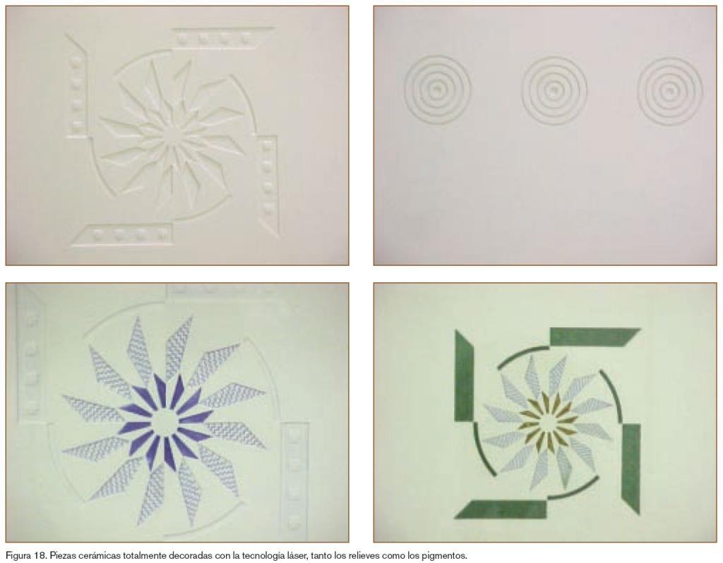 Por medio de la tecnología láser se han logrado importantes avances en el campo de la decoración de baldosas cerámicas tanto en lo referente a la síntesis de pigmentos in situ en la propia superficie de la baldosa cerámica, como también la posibilidad de obtener relieves que no son posibles con otros métodos convencionales (figura 18).